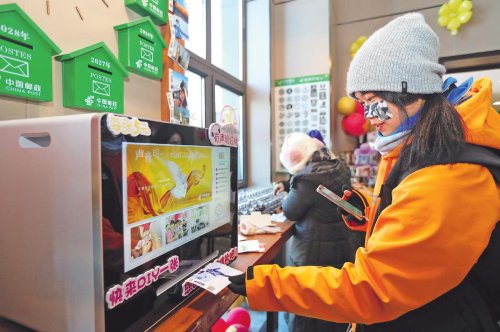 前來滑雪的游客在雪都郵局現(xiàn)場體驗(yàn)打印個(gè)人專屬有聲明信片服務(wù)?!蹼 z