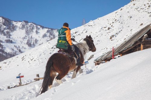 暴雪后的禾木鄉(xiāng)行路艱難。為將郵件及時(shí)送到半山腰處的養(yǎng)蜂戶家中,鄉(xiāng)郵員在進(jìn)入山區(qū)后騎馬投送郵件。□安昆 攝