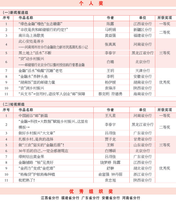 自活動啟動以來,郵儲銀行各級機構積極響應,廣大員工踴躍參與,共收到來稿1100余篇(含短視頻)。按照公平、公正、公開的原則,評審專家評選出入圍稿件,并結合線上展播投票情況,分別評選出“新聞報道組”“短視頻組”一等獎1名、二等獎2名、三等獎3名、優(yōu)秀獎5名;根據各單位投稿、發(fā)稿和獲獎情況,評選出“優(yōu)秀組織獎”5名(見下表)。