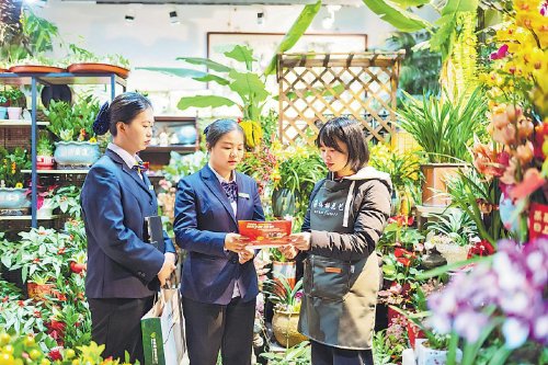 郵儲銀行福建省莆田市分行工作人員向鮮花商戶推介金融產(chǎn)品,根據(jù)商戶的生產(chǎn)經(jīng)營情況,為他們制定個(gè)性化融資服務(wù)方案。□黃益強(qiáng) 攝