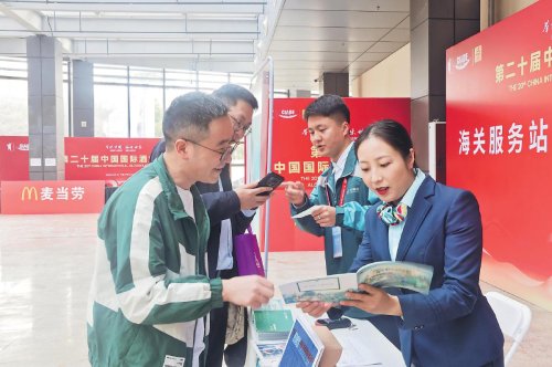 圖為郵政服務(wù)人員在為觀眾推介產(chǎn)品、辦理業(yè)務(wù)。
