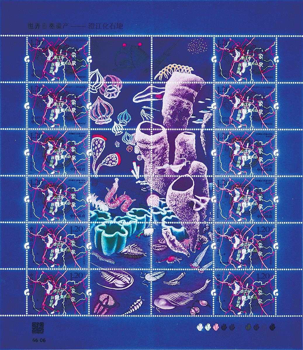 2024年是澄江遺址發(fā)現(xiàn)40周年,中國郵政在4月18日“世界遺產(chǎn)日”當(dāng)天發(fā)行《世界自然遺產(chǎn)——澄江化石地》特種郵票一套3枚。在郵票主圖中,設(shè)計師用彩鉛的手法繪制中華微網(wǎng)蟲化石、環(huán)飾蠕蟲與吸盤古宿蟲共生化石和延長撫仙湖蟲化石,并疊加澄江地圖;郵票附圖中不僅展示了三種化石的復(fù)原圖,更展示了多達(dá)37個古生物所組成的海底古生物群落的生活場景。