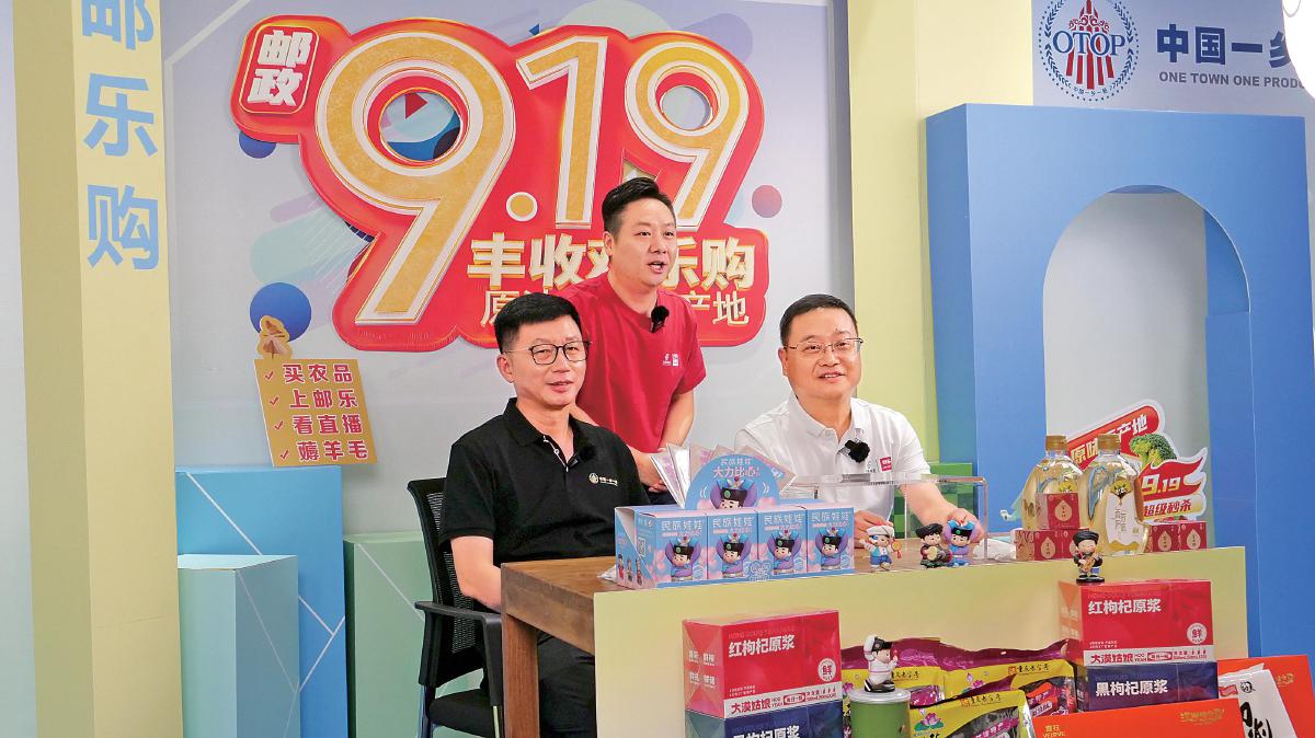 李唐(右)、中國民族貿(mào)易促進會會長藍軍(左)走進郵樂直播間為優(yōu)質(zhì)農(nóng)品“帶貨”。