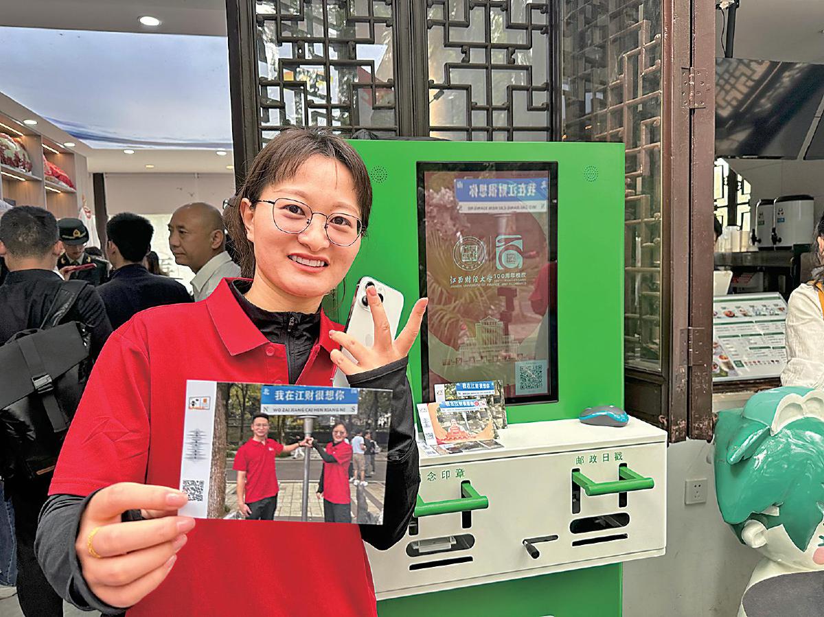 “江財(cái)百年,‘郵’我更精彩?!?023年10月28日,江西財(cái)經(jīng)大學(xué)舉行建校100周年慶典,郵政作為慶典邀請(qǐng)協(xié)助方進(jìn)駐校園提供服務(wù)。除前期定制個(gè)性化郵政明信片及各類文創(chuàng)產(chǎn)品外,現(xiàn)場(chǎng)設(shè)置的明信片打印機(jī)儼然成為校慶活動(dòng)的網(wǎng)紅打卡點(diǎn),手持明信片拍照成了不少校友的必做項(xiàng)目。