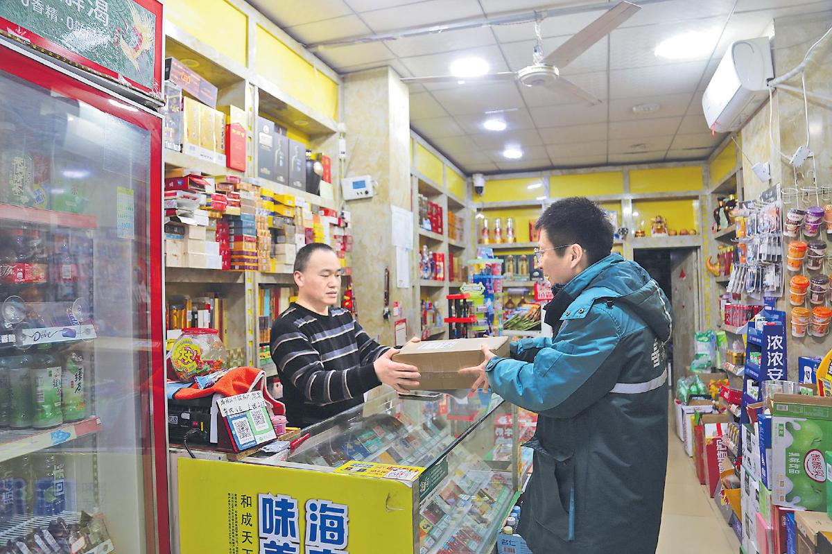 劉冬為商鋪客戶投遞郵件。