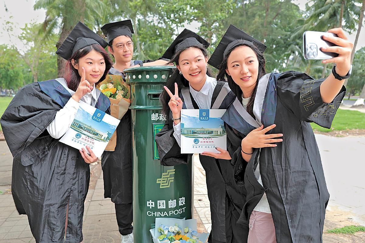 5月21日,海南大學(xué)外國語學(xué)院2024屆畢業(yè)生拿著《畢業(yè)紀(jì)念冊》在郵筒前打卡拍照,留下一份獨特的美好記憶。