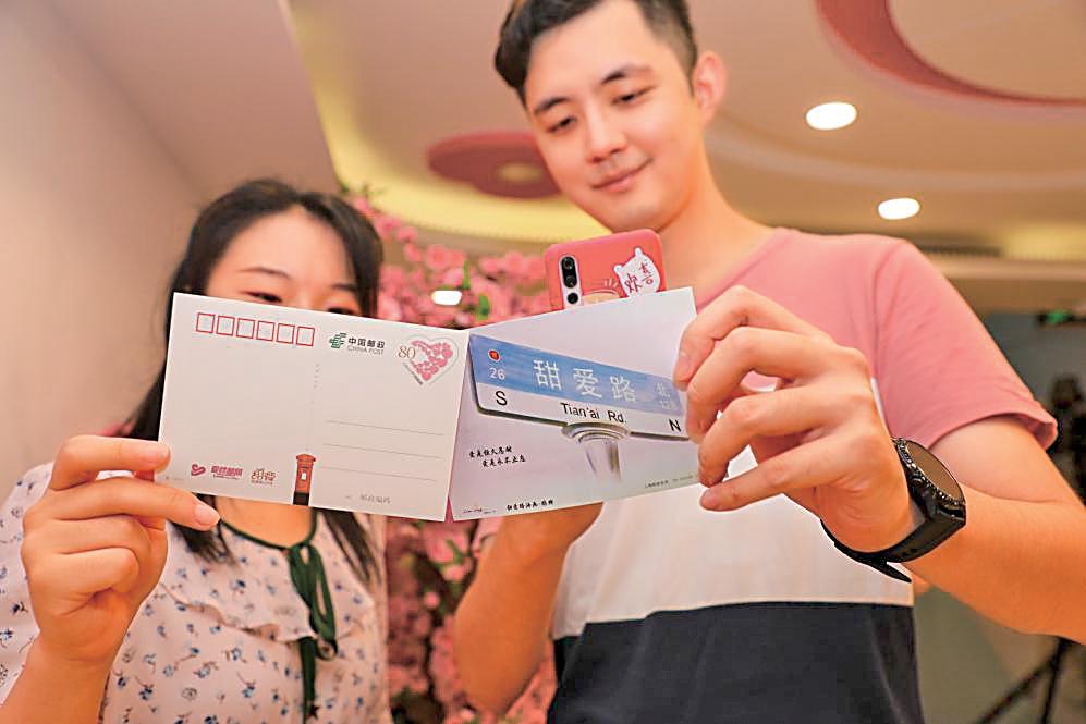 5月20日一大早,位于上海最“甜”的馬路——甜愛(ài)路上的甜愛(ài)婚姻登記中心已經(jīng)聚集了不少新人。他們或手牽手,或相依偎,臉上洋溢著幸福的笑容。現(xiàn)場(chǎng)正在舉辦的是由上海愛(ài)情郵局和甜愛(ài)婚姻登記中心共同發(fā)起的“520”主題活動(dòng)?;橐龅怯浿行膬?nèi)的郵政展位前,新人們興奮地排隊(duì)等待著,他們有的在“愛(ài)情明信片”上寫(xiě)下愛(ài)情寄語(yǔ),有的將婚紗照定制成精美的愛(ài)情郵折或愛(ài)情儲(chǔ)值卡。最讓人期待的環(huán)節(jié)莫過(guò)于將寫(xiě)有甜蜜話語(yǔ)的明信片投入粉色的“愛(ài)情郵筒”,讓愛(ài)的儀式感瞬間拉滿。