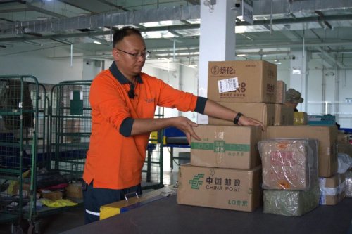 工人邊取件邊說:“只要我們把地址寫成郵件寄存點,郵車就能給我們送過來,我們又能愉快地買買買了。”