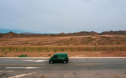 綠色的郵車行駛在戈壁間