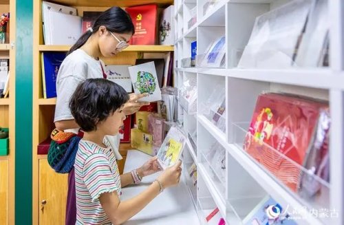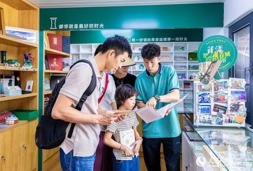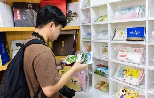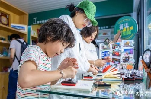 6月18日,來自福建的游客在呼和浩特市玉泉區(qū)塞上老街旅游休閑街區(qū)“塞上主題郵局”內(nèi)參觀、選購(gòu)。