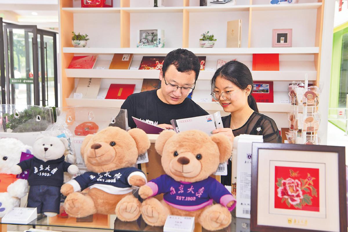 在王泉引導(dǎo)下,記者發(fā)現(xiàn),郵局外“南大文化墻”上的“金句”“地標”,展現(xiàn)著南大校史;郵局內(nèi)設(shè)計的郵票狀打卡點,是以南京大學(xué)標志性建筑北大樓的手繪和南大?;諡辄c綴;裝有《南京大學(xué)建校一百一十周年》紀念郵票和《中國郵政開辦一百二十周年》紀念郵票版票的鏡框懸掛在綜合服務(wù)區(qū)柜臺兩側(cè),交相輝映……南大郵局處處體現(xiàn)出郵文化和南京大學(xué)校園文化的連接。