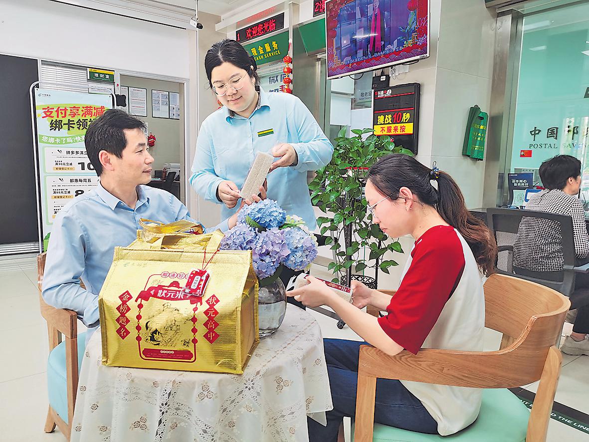 郵政工作人員在網點向客戶推介“狀元米”祈福禮盒?!蹶愪J 攝