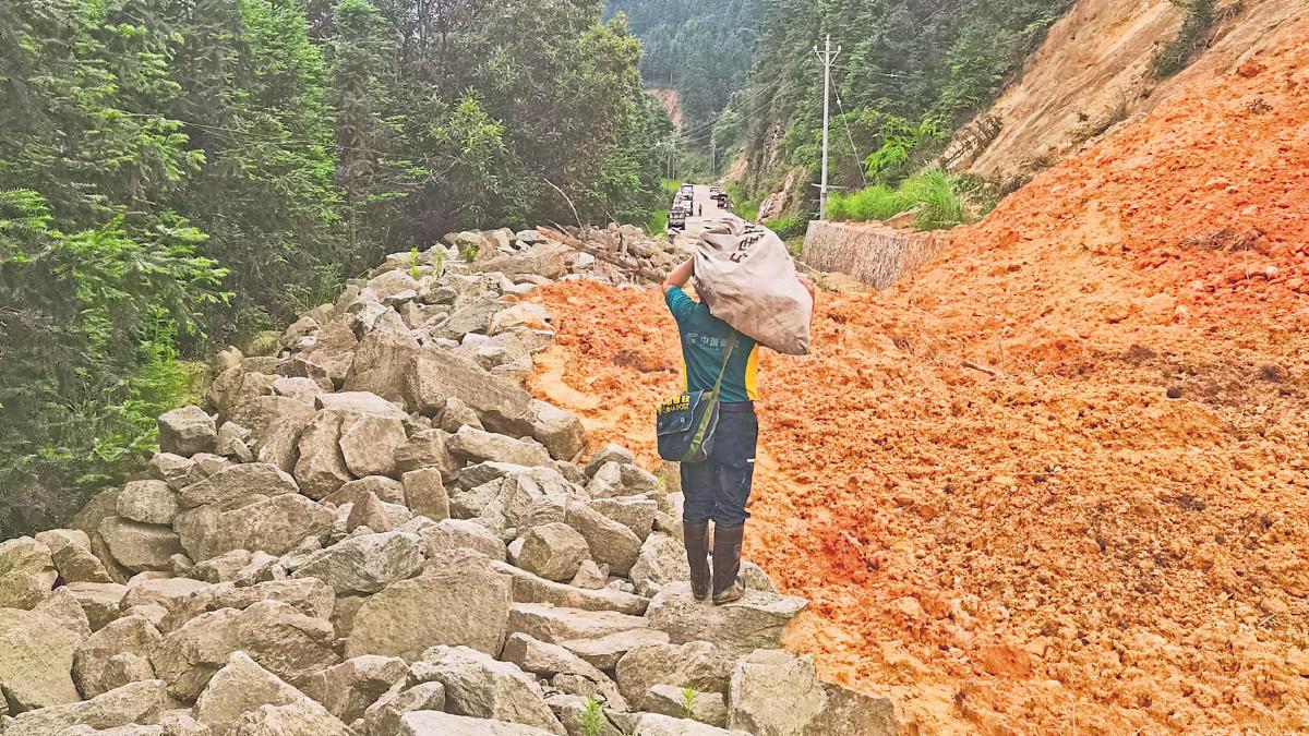 廣西壯族自治區(qū)柳州市融水苗族自治縣因洪水突發(fā)山體滑坡,融水縣郵政分公司工作人員徒步走過(guò)滑坡區(qū),為黨鳩村村民投遞包裹?!觞S建勛 攝