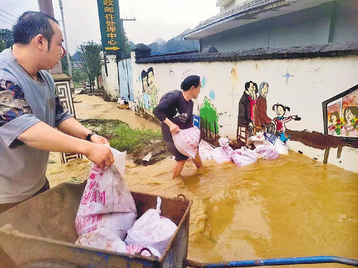 在貴州省黔東南苗族侗族自治州,山洪沖擊鎮(zhèn)遠(yuǎn)縣郵件處理中心,郵政員工用沙袋堵洪引流,緩解水患。 □周尚明 攝
