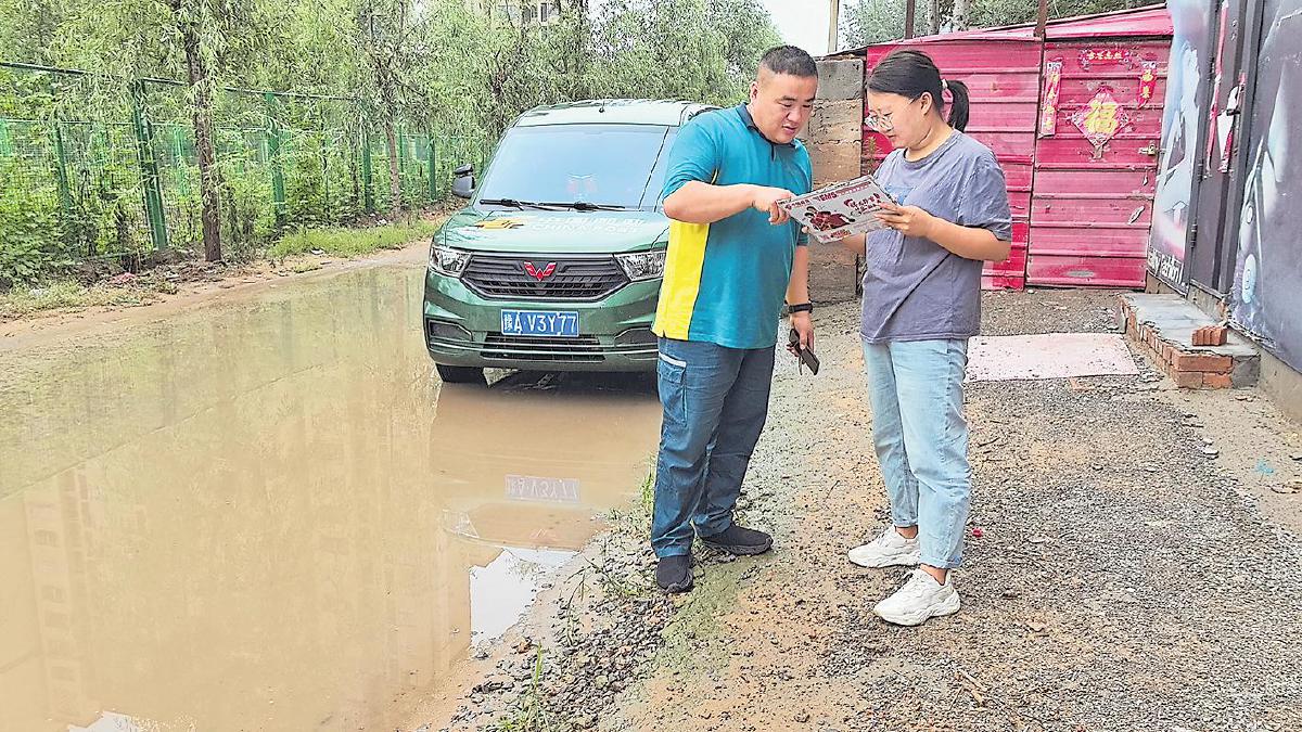 7月9日,河南省鄭州市中牟縣郵政分公司雁鳴湖支局投遞員在暴雨后,第一時(shí)間將郵件送到客戶(hù)手中?! 跖沓獭z