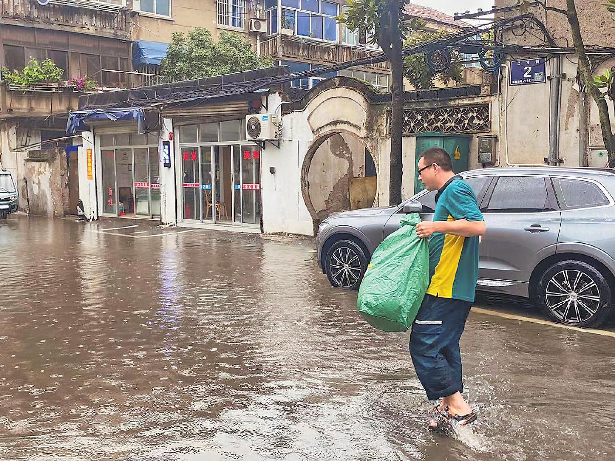 江蘇省蘇州市太倉(cāng)縣郵政分公司投遞員冒雨蹚水投遞郵件?! 跣煊裢ぁz