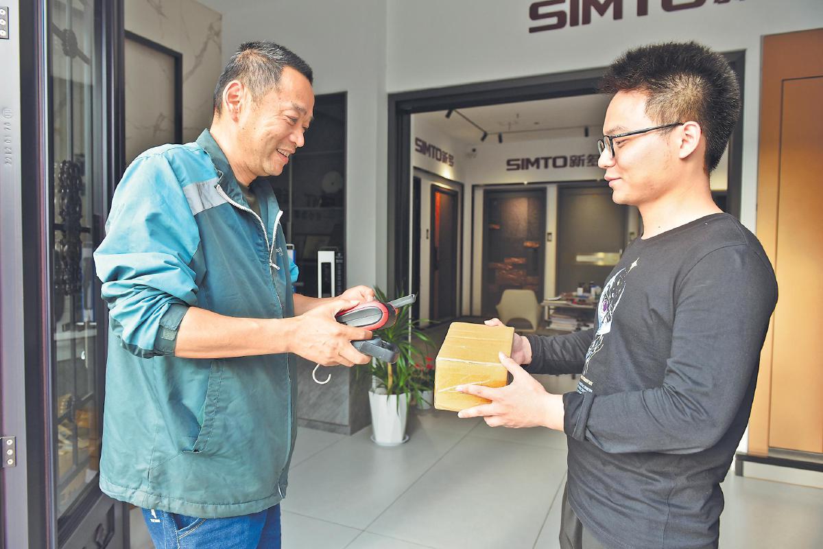 江蘇省南通市海門區(qū)郵政分公司員工上門為客戶提供退換貨寄遞服務(wù)。 □王歡 攝