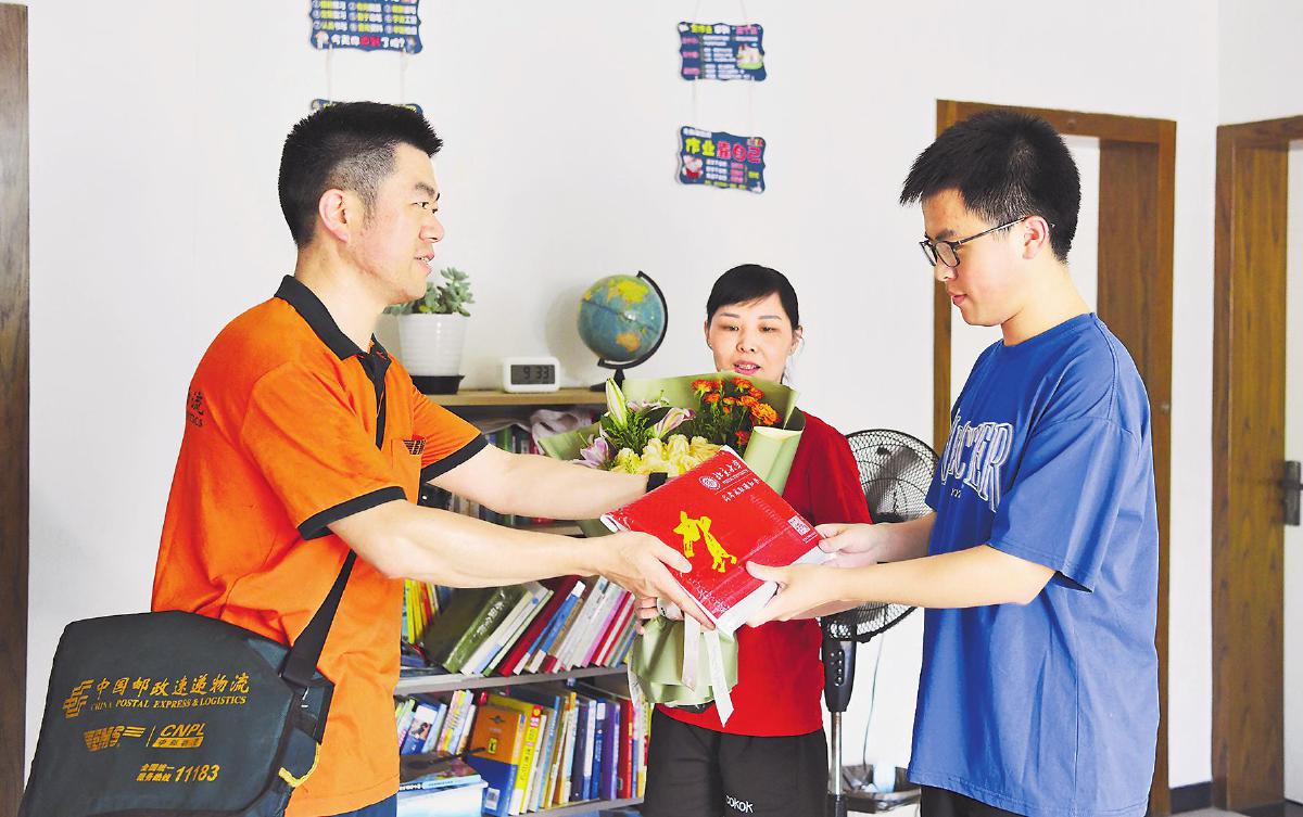 7月21日上午,浙江省永嘉縣郵政分公司員工王小蒙為兒子王傳祈送上北京大學(xué)錄取通知書。收到父親送來的錄取通知書,王傳祈很激動,感謝父親以辛勤的工作為自己樹立了榜樣,表示上大學(xué)后要繼續(xù)努力學(xué)習(xí),以優(yōu)異的成績回報父母。王小蒙參加郵政工作已有16年,送了很多件高考錄取通知書,這是他最幸福、最特殊的一次投遞。他希望兒子今后用所學(xué)的知識為國家貢獻(xiàn)自己的一份力量。
