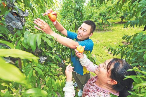 郵政員工與桃農(nóng)一起采摘鮮桃,共享豐收的喜悅?!跞f(wàn)宇 攝