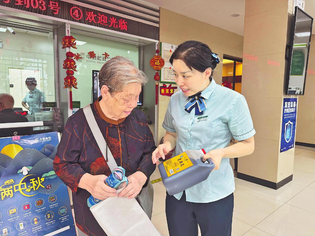 “月滿中秋”活動中,郵政網(wǎng)點(diǎn)員工向客戶推介陳醋產(chǎn)品。