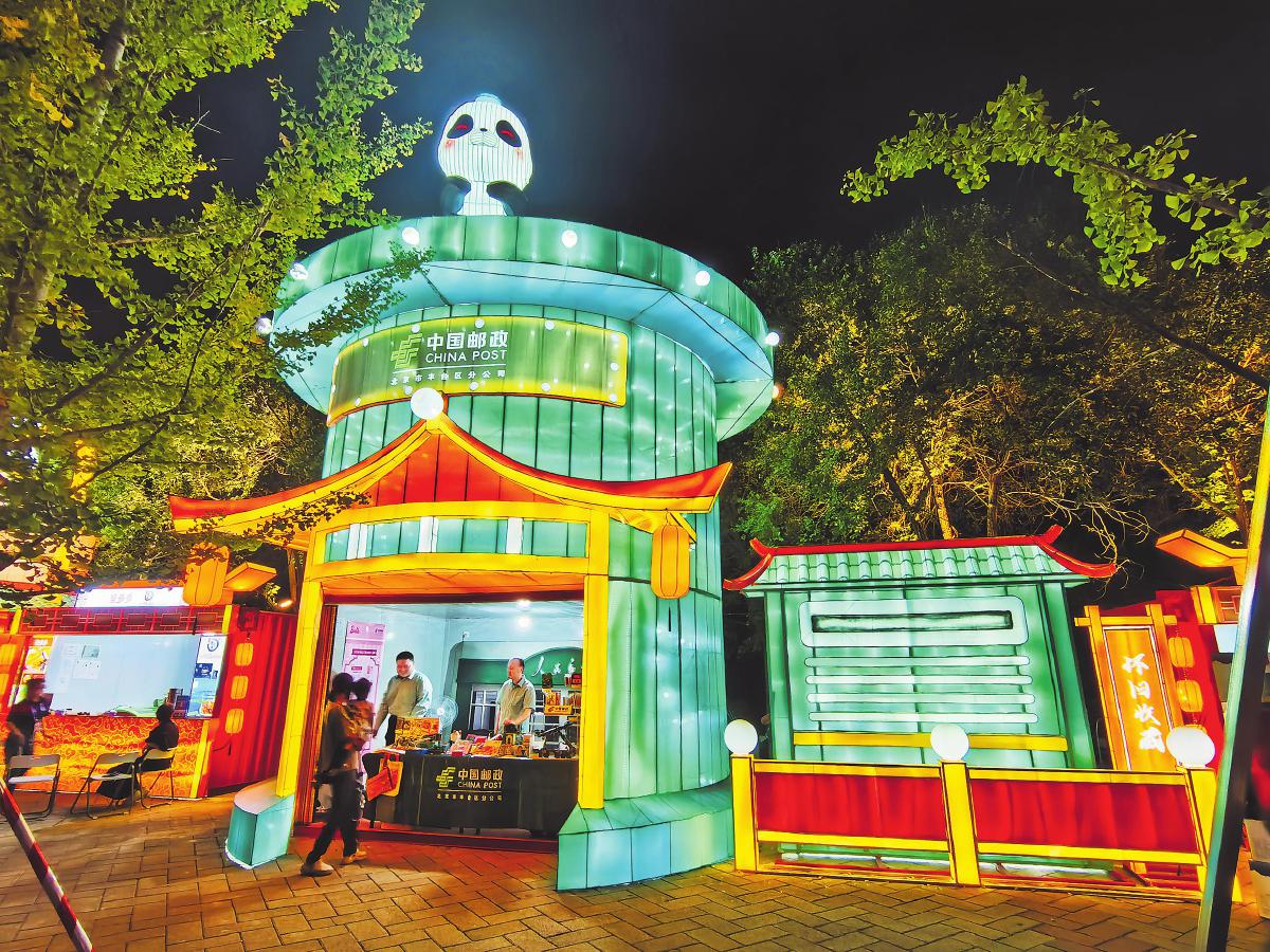 9月14日,北京首屆“京彩燈會(huì)”——園博園中秋國(guó)慶彩燈游園會(huì)盛大開(kāi)幕。此次燈會(huì)規(guī)模宏大,是四川自貢燈會(huì)在北京的再度精彩呈現(xiàn),為廣大游客帶來(lái)了一場(chǎng)融合傳統(tǒng)文化與現(xiàn)代創(chuàng)意的視覺(jué)盛宴。燈會(huì)上,一組藍(lán)綠色調(diào)的郵筒花燈格外引人注目。這組花燈具有濃厚的中式建筑風(fēng)格,展現(xiàn)了郵筒的傳統(tǒng)形象,特別是上方的熊貓?jiān)O(shè)計(jì),憨態(tài)可掬。為更好地服務(wù)“京彩燈會(huì)”,北京市豐臺(tái)區(qū)郵政分公司專門設(shè)計(jì)了園博園燈會(huì)紀(jì)念章,還推出了一系列融合郵政傳統(tǒng)文化與現(xiàn)代元素的文創(chuàng)產(chǎn)品,深受游客的青睞。