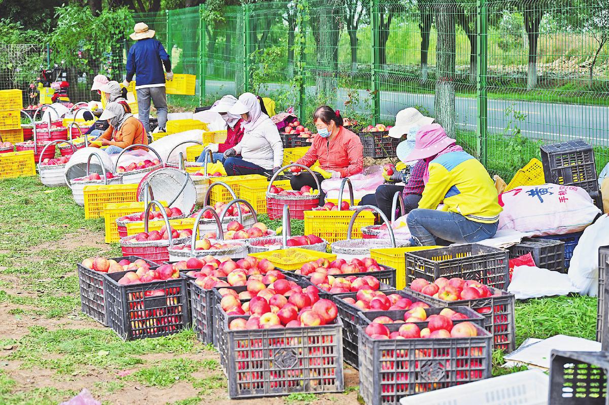 果農(nóng)在蘋(píng)果種植基地選果,準(zhǔn)備通過(guò)郵政發(fā)運(yùn)?!跬跣銟s 攝