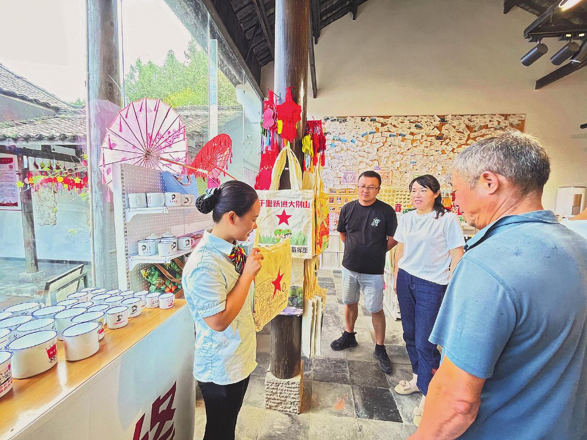 紅軍郵局工作人員正在向游客介紹各類紅色文創(chuàng)產(chǎn)品。