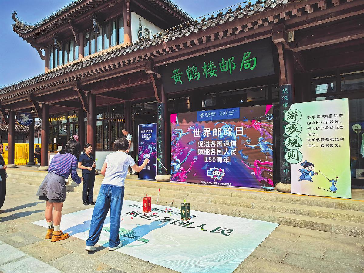 湖北省武漢市郵政分公司在黃鶴樓郵局、東湖高新政務(wù)中心以及全市各個郵政網(wǎng)點舉辦了形式多樣的世界郵政日主題宣傳活動。位于黃鶴樓景區(qū)東門的黃鶴樓郵局在世界郵政日當(dāng)天開展了集戳打卡、趣味投壺、書畫展示等豐富多彩的活動,吸引了不少市民和游客參與?! 跣し肌£惥辍z