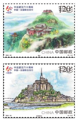 10月18日,《中法建交六十周年》(與法國(guó)聯(lián)合發(fā)行)紀(jì)念郵票發(fā)行。該套郵票一套2枚,郵票圖案名稱分別為“1.泰山”和“2.圣米歇爾山”。