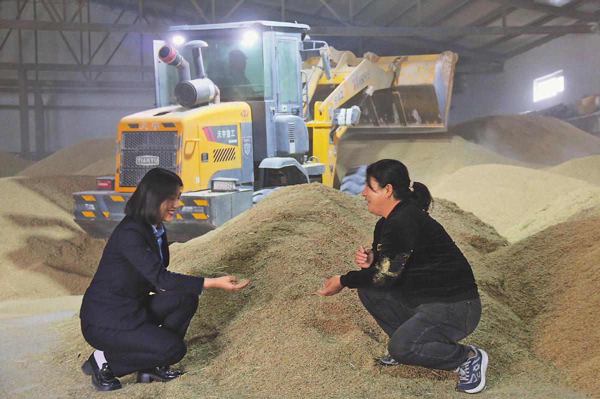 吳志霞向?yàn)豸斈君R市分行客戶經(jīng)理孔阿朵介紹稻谷歸倉情況。