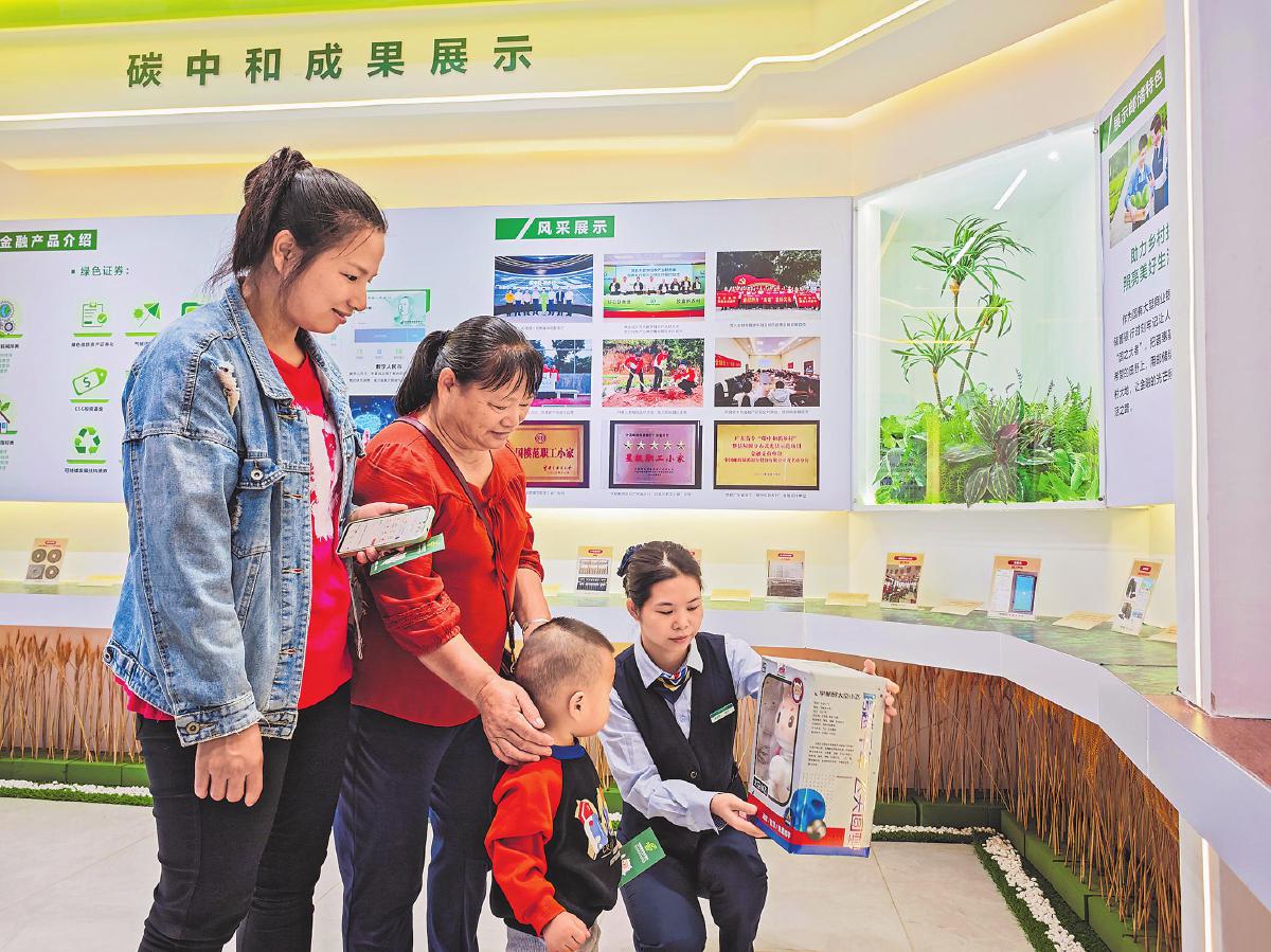 “少開一公里汽車,就減少0.22kg的碳排放量;省一度電,就減少0.638kg的碳排放量;少丟1kg垃圾,就減少2.06kg的碳排放量……”這些與個(gè)人低碳生活密切相關(guān)的科普知識點(diǎn),被醒目地安排在展廳第一塊展板上。之后,國家“雙碳”(碳達(dá)峰、碳中和)目標(biāo)政策、高州市的資源稟賦、郵儲銀行綠色金融產(chǎn)品介紹等展板直觀生動地宣傳著各類綠色環(huán)保知識。更特別的是,碳中和支行還用一組圖片梳理了從貝殼到鑄幣再到紙幣,最后到數(shù)字人民幣的貨幣演變過程。展臺特意設(shè)計(jì)得比較低,小朋友參觀時(shí)可以隔著玻璃平視看到圖片和模具。參觀者的留言區(qū),更是給展廳增添了互動功能。