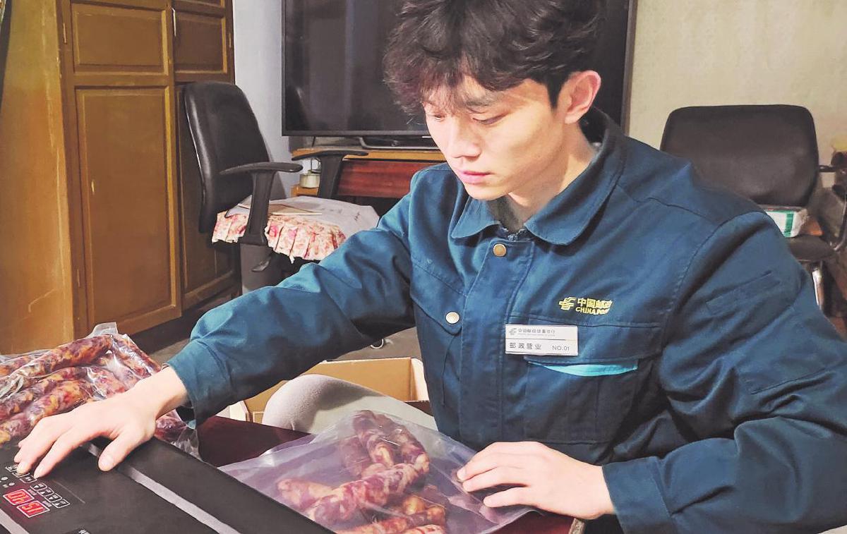 郵政工作人員為群眾郵寄的臘肉進(jìn)行真空包裝?!跬跤罘z