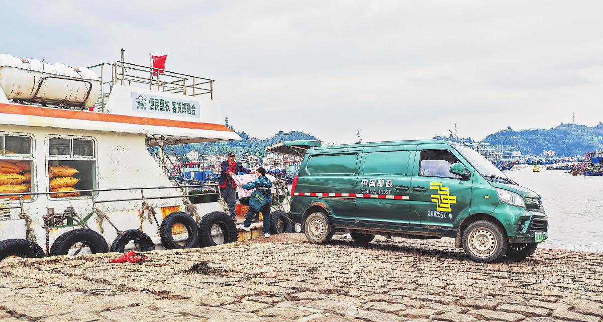 截至12月20日,福建省寧德市郵政分公司已建成客貨郵融合中心鄉(xiāng)鎮(zhèn)站點(diǎn)81個(gè)、村級(jí)站點(diǎn)1059個(gè)、“交郵聯(lián)運(yùn)”線路25條,快遞進(jìn)村業(yè)務(wù)量達(dá)1651萬件,比2023年增長(zhǎng)53%。在大力推進(jìn)客貨郵融合項(xiàng)目中,寧德郵政積極對(duì)接交通運(yùn)輸部門,開通全省首條“海上客貨郵融合線路”,推行水陸聯(lián)動(dòng)新模式,為海島居民和海上養(yǎng)殖戶提供貼心服務(wù)。圖為在霞浦縣下滸鎮(zhèn)外滸碼頭,郵政員工與客運(yùn)班船工作人員進(jìn)行郵件交接。