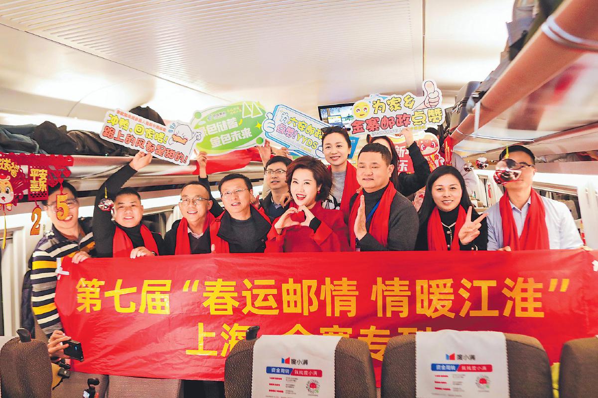 1月22日,安徽省第七屆“春運(yùn)郵情 情暖江淮”活動迎接皖籍務(wù)工創(chuàng)業(yè)人員返鄉(xiāng)專列(廂)首發(fā)儀式在上海松江、江蘇無錫、浙江臺州三地同步舉行,當(dāng)日開行的“上?!鹫睂A泻汀盁o錫—太和”“臺州—青陽”列車專廂免費(fèi)承運(yùn)776名皖籍務(wù)工人員返鄉(xiāng)過年。本屆活動預(yù)計(jì)開通專列(專廂)30趟,接回返鄉(xiāng)務(wù)工創(chuàng)業(yè)人員6500余人。