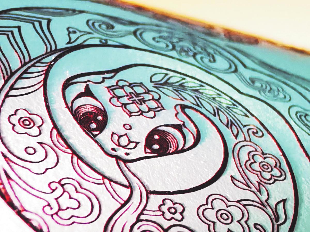 優(yōu)秀的印制質(zhì)量離不開(kāi)優(yōu)秀的原材料。在此次生肖郵票的印制中,北京郵票廠首次使用了新研發(fā)的觸感雕刻油墨。雕刻油墨顏色更深更亮,觸感更明顯。用放大鏡觀察《乙巳年》特種郵票中的雕刻線條,可以看到繪畫筆觸似的刀鋒,用手指在紙上輕輕撫摸時(shí),圖像輪廓有明顯的凸起感。