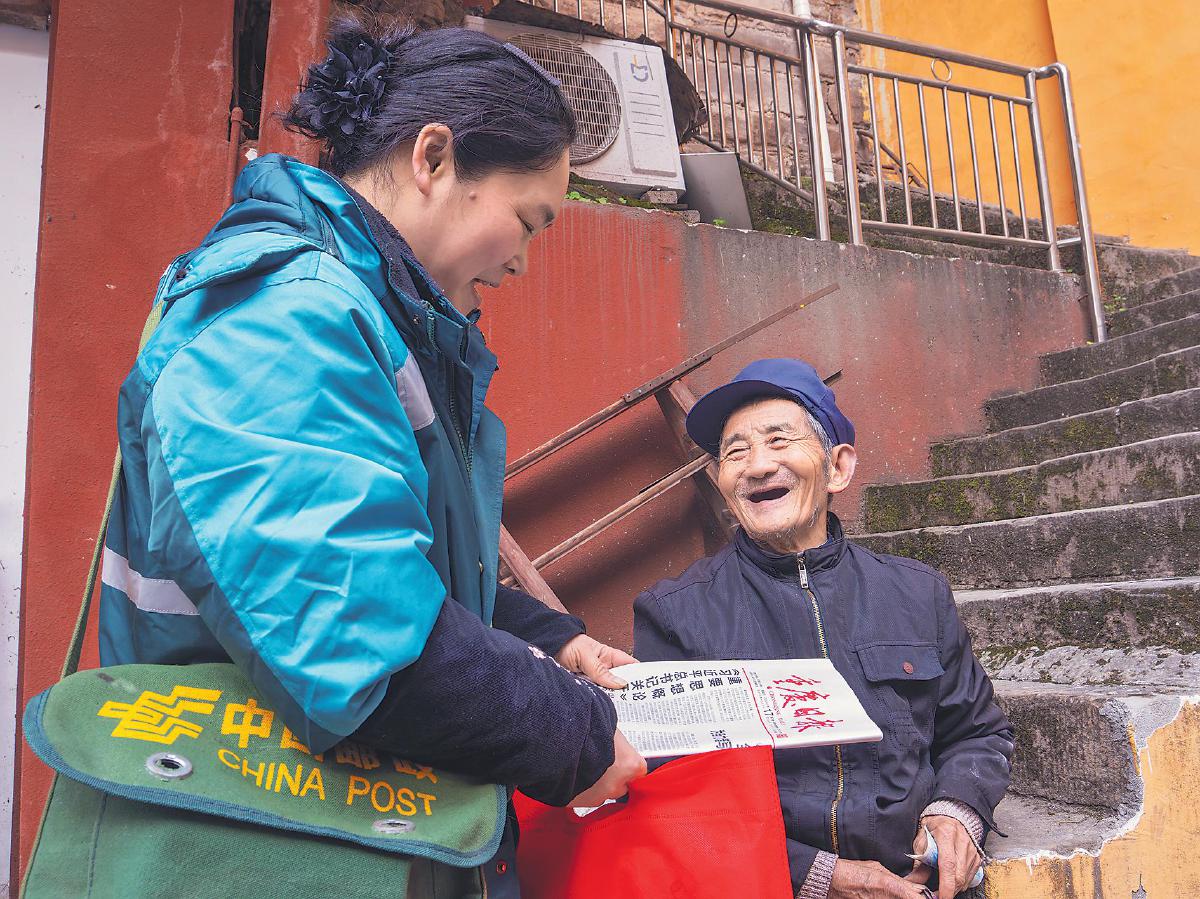1月17日,重慶市武隆區(qū)郵政分公司投遞員穿越嚴(yán)寒給客戶送上黨報(bào)?! 跬踅鹎f 攝