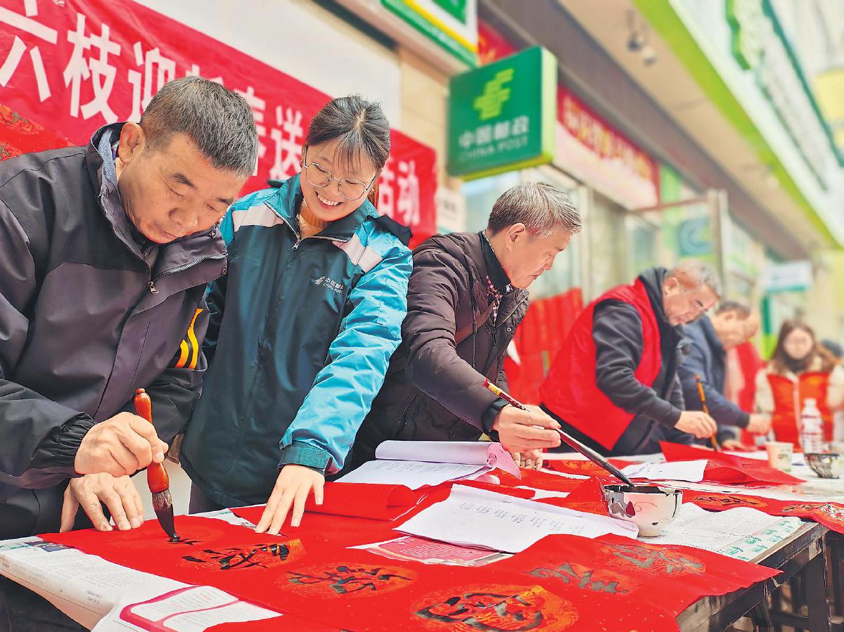 春節(jié)前夕,貴州省六盤水市六枝特區(qū)郵政分公司攜手特區(qū)總工會(huì)和特區(qū)書法家協(xié)會(huì)舉辦“筆走龍蛇祈平安,翰墨飄香迎新春”活動(dòng),免費(fèi)為群眾寫“?!弊帧⑺痛郝?lián)?! 踉k 攝