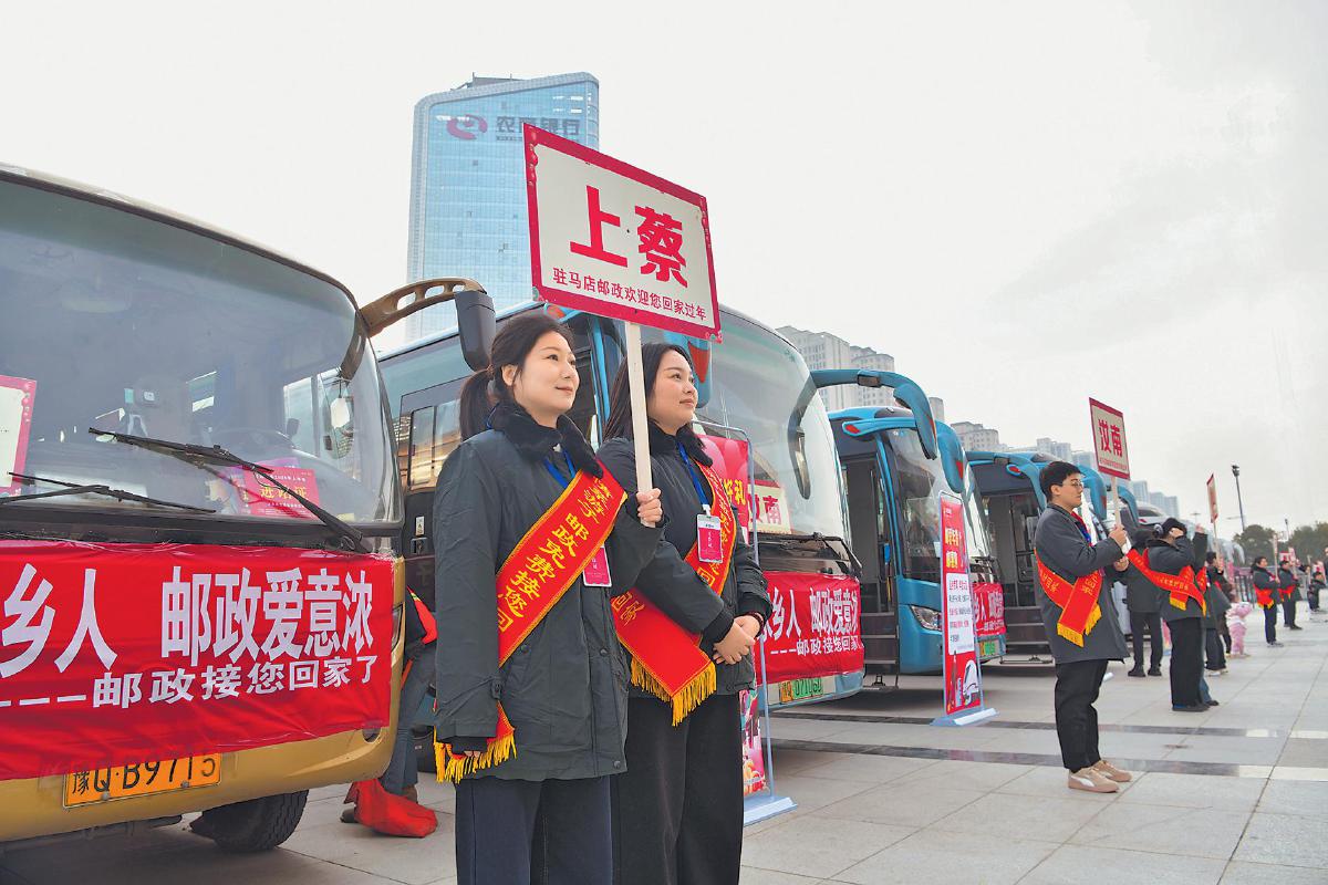 1月21日—27日,河南省駐馬店市郵政分公司開展“情系游子,郵政免費(fèi)接您回家”活動(dòng)。圖為郵政員工在駐馬店西站熱情歡迎返鄉(xiāng)游子?! 踬Z紅偉 攝