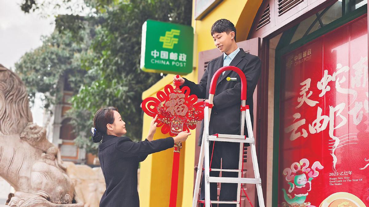 1月26日,云南省紅河哈尼族彝族自治州河口縣口岸郵政支局員工為支局換上新年“盛裝”?!跞娇 z