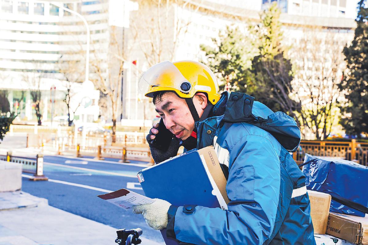 近幾日,受寒潮影響,西北、華北等地出現(xiàn)大風(fēng)天氣,降溫明顯。郵政投遞員克服天氣影響,按時(shí)出班,將一件件傳遞“溫暖”的包裹及時(shí)、準(zhǔn)確送達(dá)客戶手中。圖為2月7日上午,北京市東城區(qū)建內(nèi)大街郵政支局投遞員張業(yè)田冒著寒風(fēng)穿行在胡同與大廈之間,按時(shí)送出100多件包裹和300多份報(bào)紙。