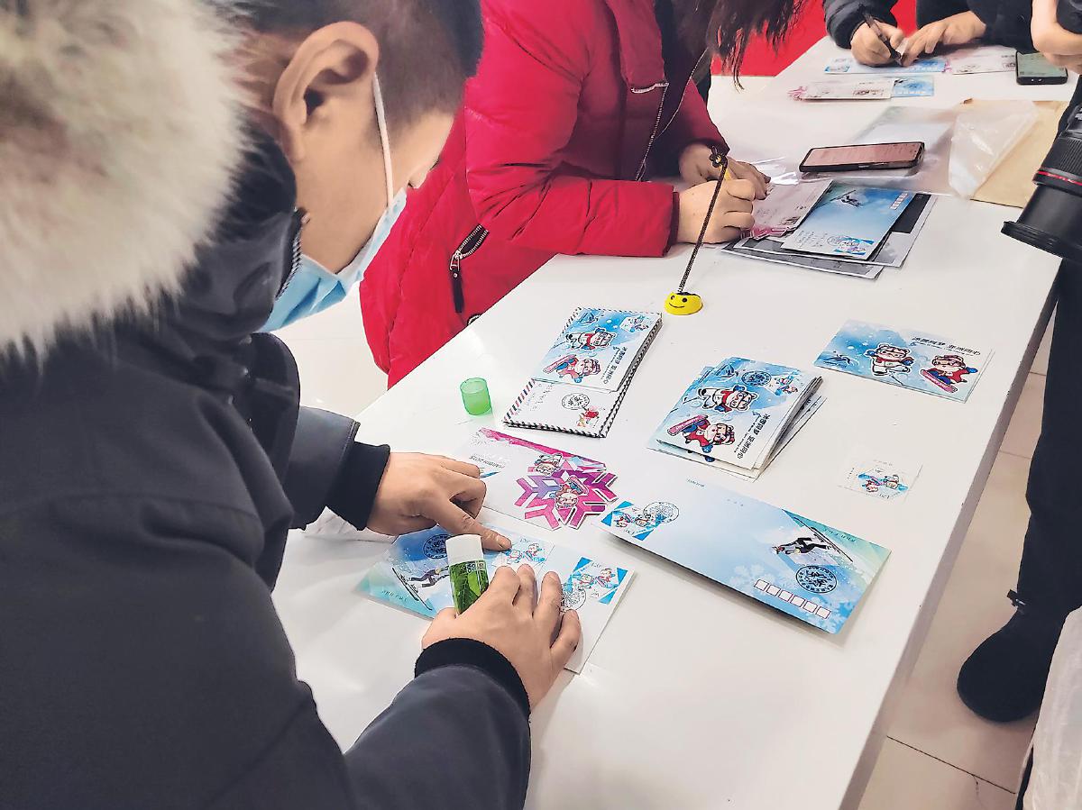 集郵愛好者在亞冬會(huì)紀(jì)念郵票首發(fā)現(xiàn)場自制首日封?! 鯊埖さぁz