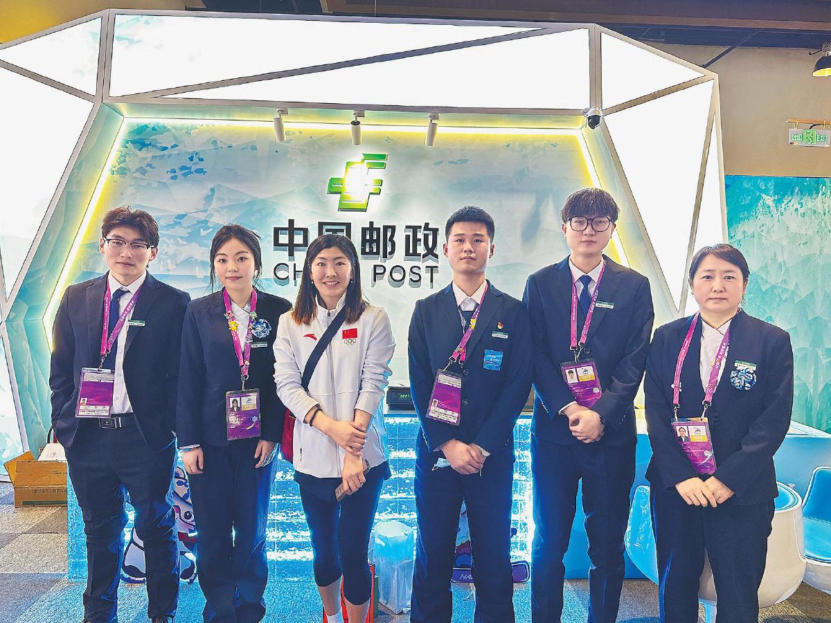 中國雪上項(xiàng)目首位全滿貫獲得者、本屆亞冬會(huì)自由式滑雪女子空中技巧項(xiàng)目冠軍徐夢(mèng)桃(左三)在雅旺斯主題郵局郵寄包裹后,與郵政員工合影留念?!跄呤佬邸z