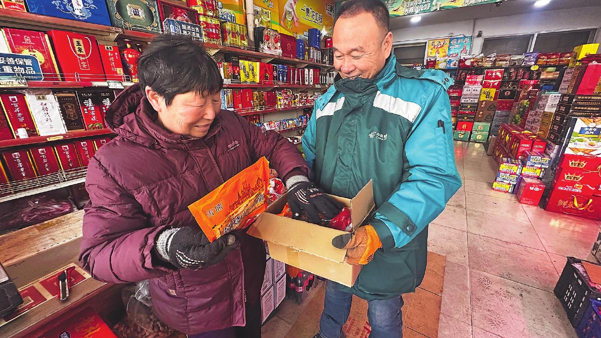 春節(jié)期間,馬鑫來到阿城區(qū)新興村的便民超市上門取件。 □冷美良 攝