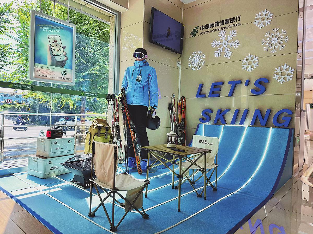 崇禮支行居于“雪國”一角,以其別具一格的創(chuàng)意與設計,于冬日里帶給客戶一抹溫暖。網(wǎng)點內(nèi)夢幻般的雪花燈、憨態(tài)可掬的雪娃娃、英姿勃發(fā)的滑雪者造型以及多樣的戶外運動裝備,無一不述說著雪國戶外天堂的故事(見下圖)。