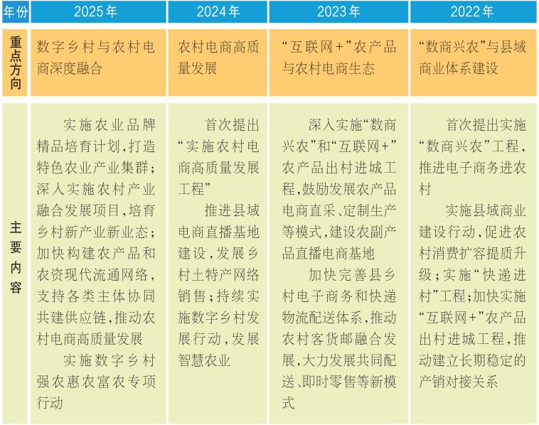 2月23日,2025年中央一號文件正式對外發(fā)布。這是黨的十八大以來,中央連續(xù)發(fā)出的第13個指導(dǎo)“三農(nóng)”工作的一號文件。近年中央一號文件及相關(guān)政策顯示,農(nóng)村電商已成為推動鄉(xiāng)村振興和實(shí)現(xiàn)農(nóng)業(yè)現(xiàn)代化的重要抓手,政策導(dǎo)向逐步深化,覆蓋基礎(chǔ)設(shè)施建設(shè)、產(chǎn)業(yè)融合、數(shù)字化升級等多個維度,從銷售到全產(chǎn)業(yè)鏈整合,從科技賦能到產(chǎn)業(yè)創(chuàng)新,從一二三產(chǎn)業(yè)融合到生態(tài)體系建設(shè),持續(xù)為推進(jìn)農(nóng)業(yè)現(xiàn)代化和鄉(xiāng)村全面振興提供強(qiáng)大的活力與動力。