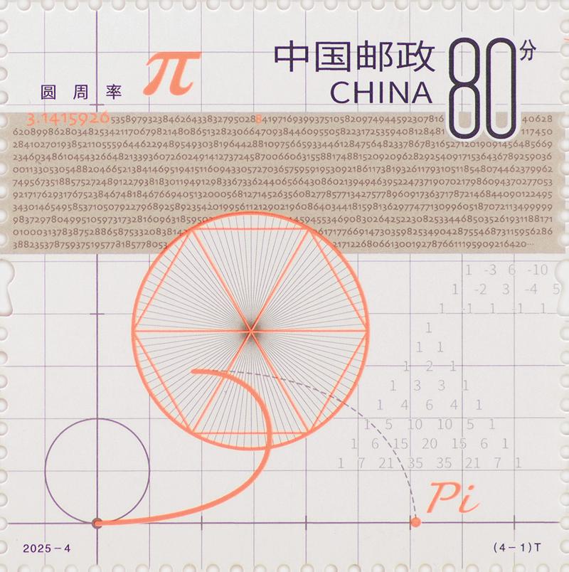 該套郵票設(shè)計(jì)語言現(xiàn)代,使人眼前一亮。第一枚“圓周率”作為廣為人知的數(shù)學(xué)常數(shù),貫穿于幾何、物理等眾多學(xué)科。郵票元素包含了π的本質(zhì)定義,以極細(xì)線表現(xiàn)早期經(jīng)典割圓法,并將圓周率小數(shù)點(diǎn)后996位以縮微文字的方式呈現(xiàn)于畫面,特別通過橘色設(shè)計(jì)突出前7位,為的是紀(jì)念我國南北朝時(shí)期數(shù)學(xué)家祖沖之。第二枚“勾股定理”是中國古代幾何學(xué)的成就之一。它給出了直角三角形三邊的長(zhǎng)度關(guān)系,即任意一個(gè)直角三角形的兩條直角邊長(zhǎng)度平方之和等于斜邊長(zhǎng)度的平方。郵票在局部采用燙印工藝,以分層的視覺形式展現(xiàn)了證明過程。第三枚“歐拉公式”被譽(yù)為“數(shù)學(xué)中最美的公式之一”,郵票以圖形的方式表現(xiàn)了歐拉公式將數(shù)學(xué)中5個(gè)重要常數(shù)(e、i、π、1、0)聯(lián)系起來。歐拉之眼圖案部分采用縮微工藝,將這5個(gè)常數(shù)與防偽技術(shù)相結(jié)合。第四枚“莫比烏斯帶”作為一種神奇的拓?fù)鋱D形,只有一個(gè)面和一條邊界。郵票采用局部燙印工藝,豐富的色彩變幻更好地呈現(xiàn)莫比烏斯帶的多維性質(zhì)。在紫外光照射下,螞蟻的足跡和畫面下方的銀河相呼應(yīng),寓意著從微觀逐步擴(kuò)展到更廣闊的宏觀領(lǐng)域。