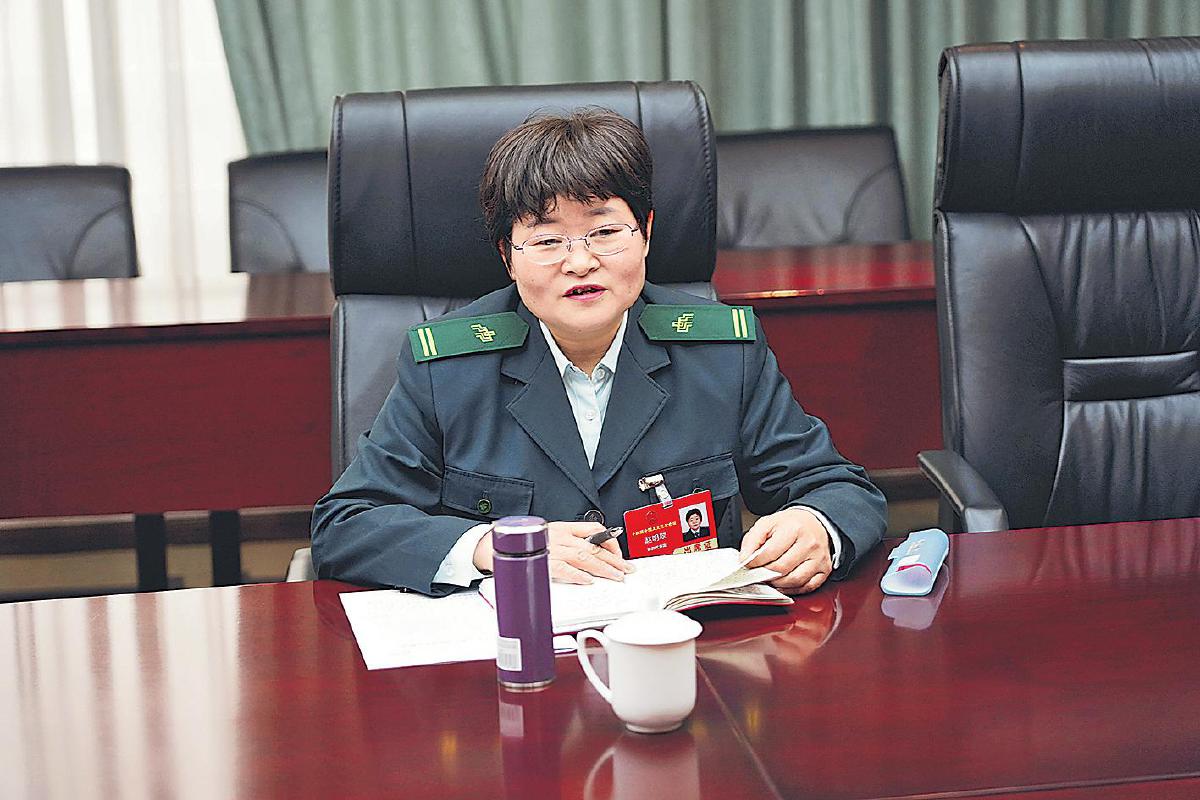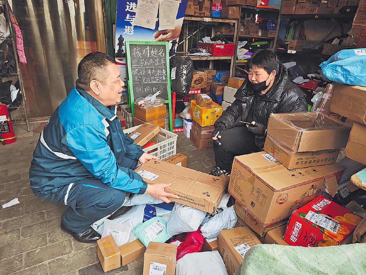 全國人大代表、河北省邢臺市郵政分公司城區(qū)寄遞事業(yè)部鄉(xiāng)郵員郭紅崗向投遞道段上的客戶講述全國兩會的盛況,傳遞黨的聲音?! 醭题暋O延兵 攝