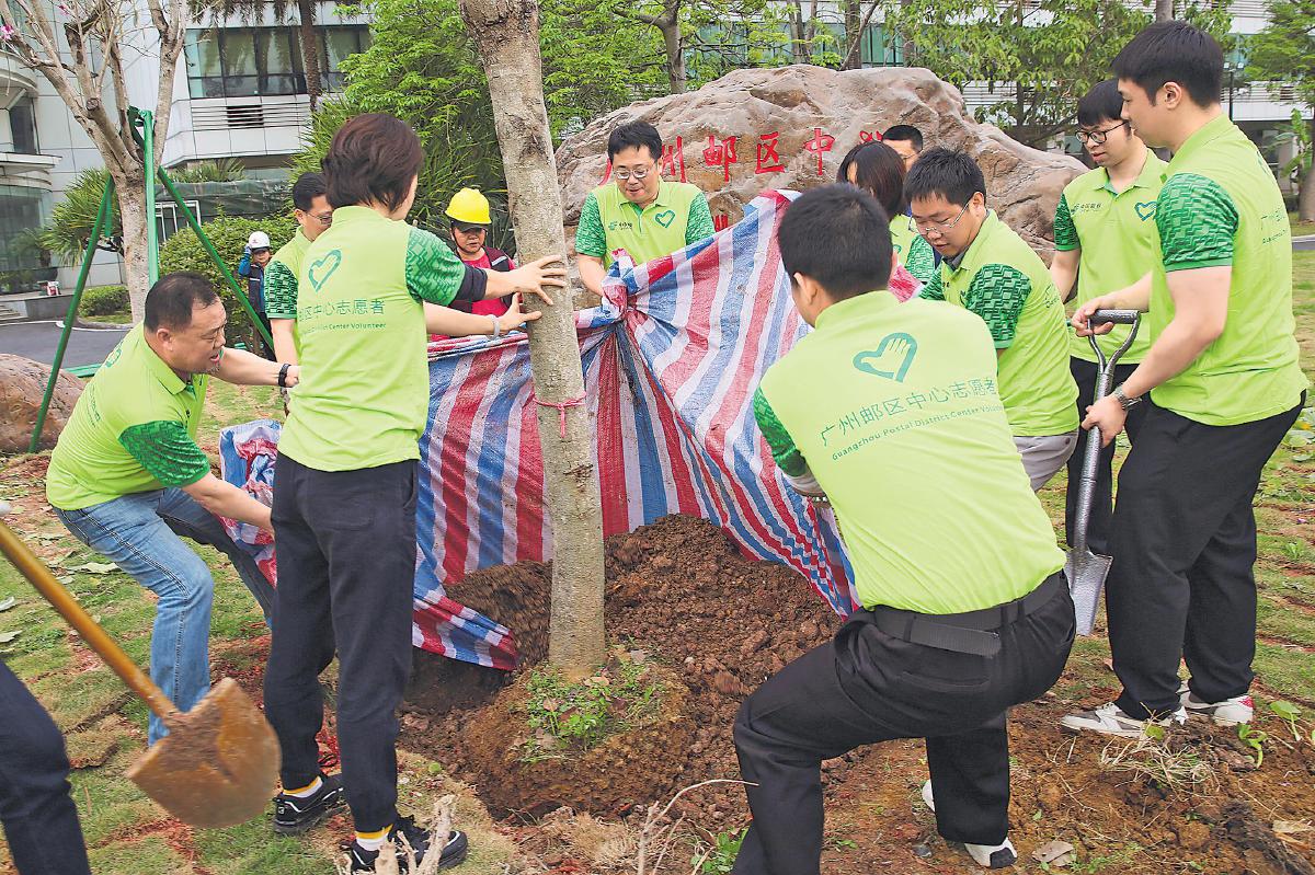 3月12日是第47個全民義務(wù)植樹節(jié),廣州郵區(qū)中心開展了義務(wù)植樹活動。活動現(xiàn)場,志愿者們熱情高漲,揮鍬鏟土、摘葉剪枝、扶樹培土、提桶澆水,大家團結(jié)協(xié)作、干勁十足?!蹶愒病£惥w民 攝影報道
