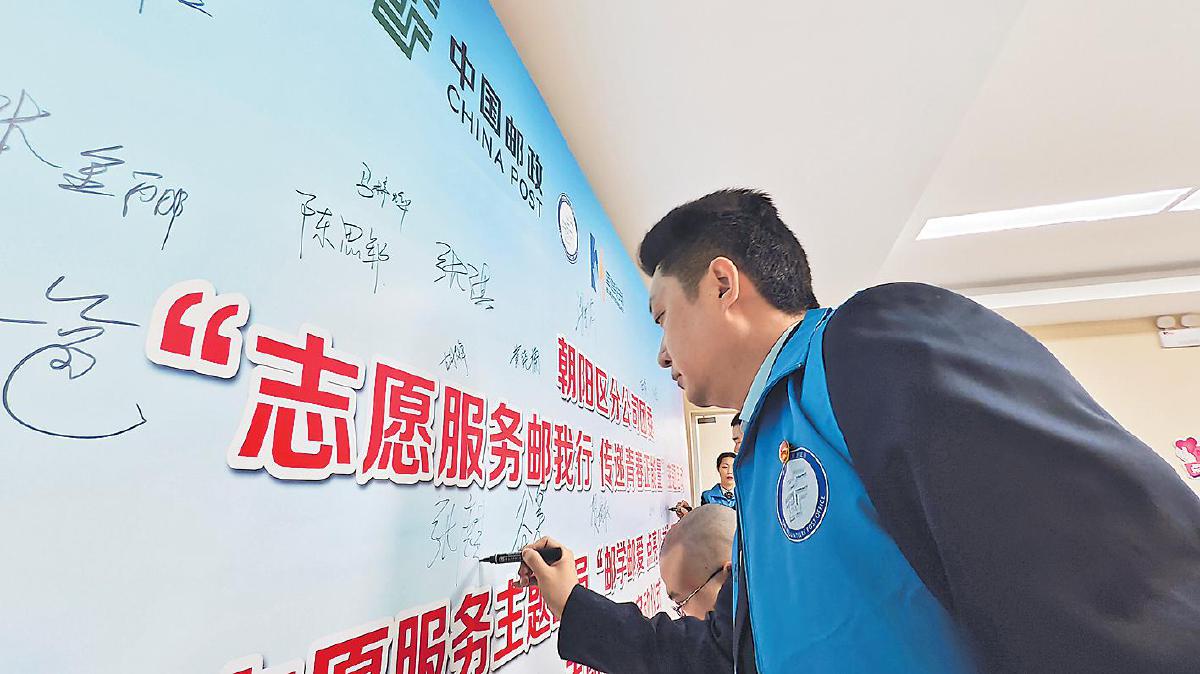 北京郵政青年志愿者在主題墻上簽下自己的名字,立志為志愿服務(wù)貢獻(xiàn)更多力量。