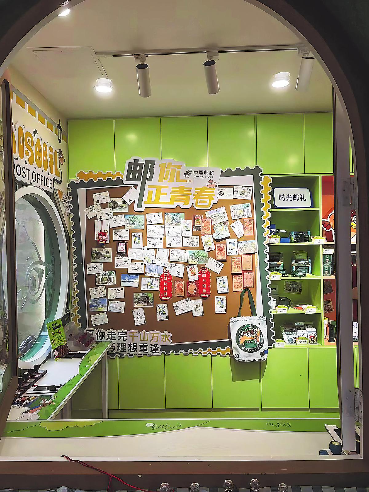 走進(jìn)小鳴郵禮郵局,仿佛置身于一個(gè)充滿童話色彩的世界。以廣州市市鳥“畫眉”為原型,融合廣東傳統(tǒng)戲劇粵劇元素打造的IP形象“小鳴”,或立于郵筒之上,或藏在明信片墻的縫隙間,仿佛在和游客捉迷藏。郵局的裝修風(fēng)格清新自然,以綠色為主色調(diào),巧妙融入可愛的卡通元素,營造出溫馨且充滿活力的氛圍。